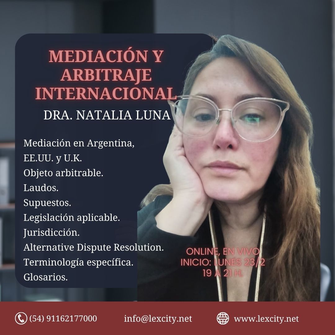 - 23/2/2026: Mediación y arbitraje internacional: Curso teórico-´práctico. Lunes, 19 a 21h. 3 clases. Modalidad online, en vivo, inglés-español.