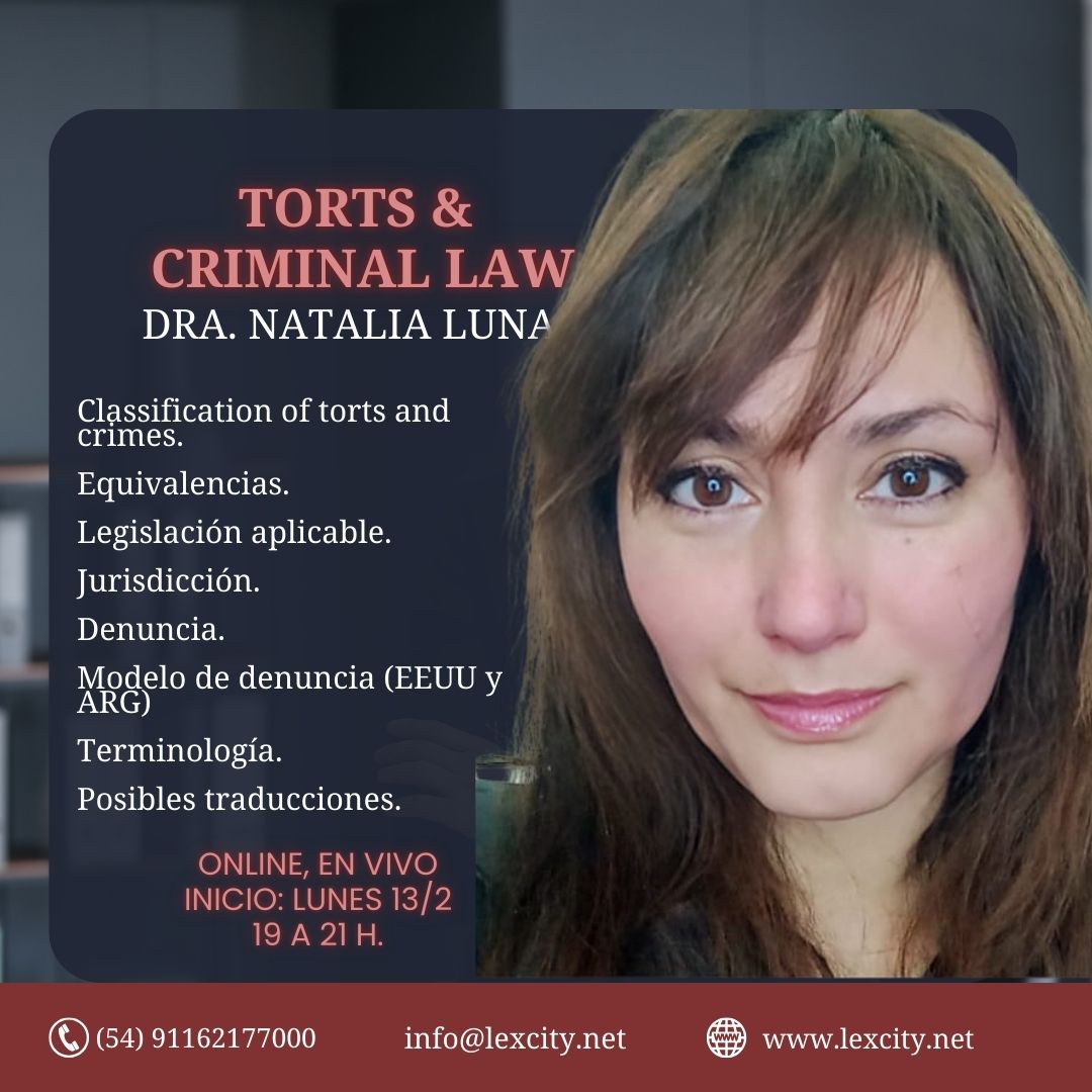 - 13/2/2026: Torts & Crimes: Curso teórico-´práctico. Viernes, de 19 a 21h. 3 clases. Modalidad online, en vivo, inglés-español.