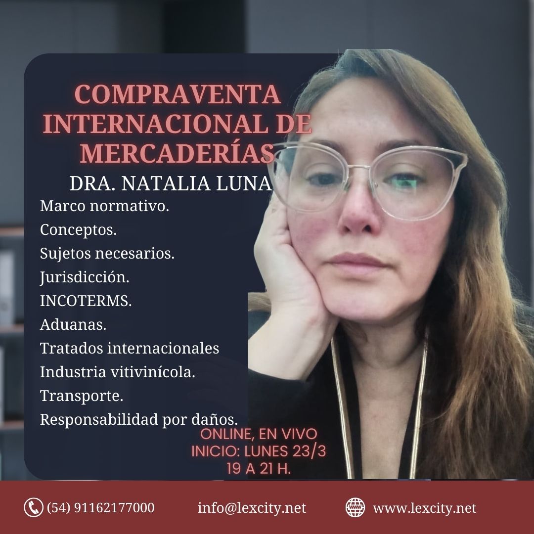 - 30/3/2026: Masterclass sobre Compraventa internacional de mercaderías, teórico-´práctica. Lunes, 19 a 21h. . Modalidad online, en vivo, inglés-español.