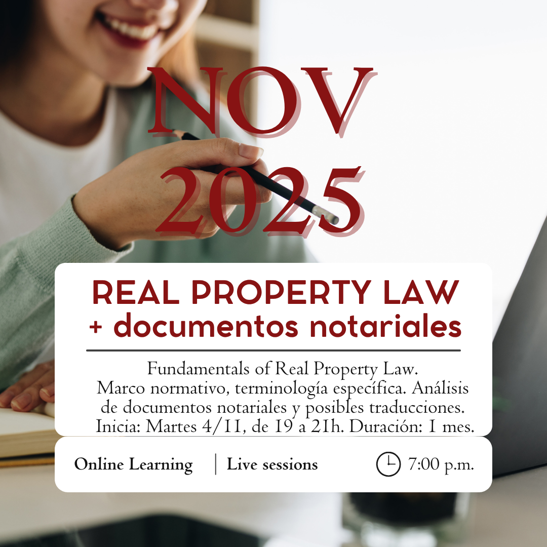 - 4/11: Real Property Law (APLE): martes, de 19 a 21h. Online, en vivo.