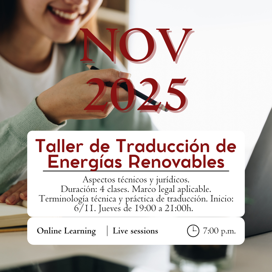 - 6/11 Taller de Traducción de Energías Renovables. Cursada: Jueves, de 19 a 21h, online, en vivo. 4 clases en total.