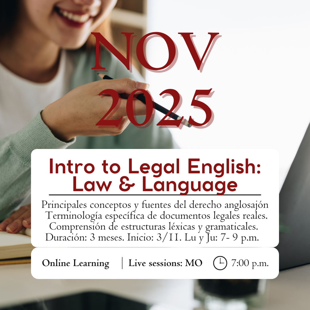 - 3/11 Intro to Legal English: Law and Language. Cursada: lunes y jueves, de 19 a 21h, online, en vivo. 12 clases en total.