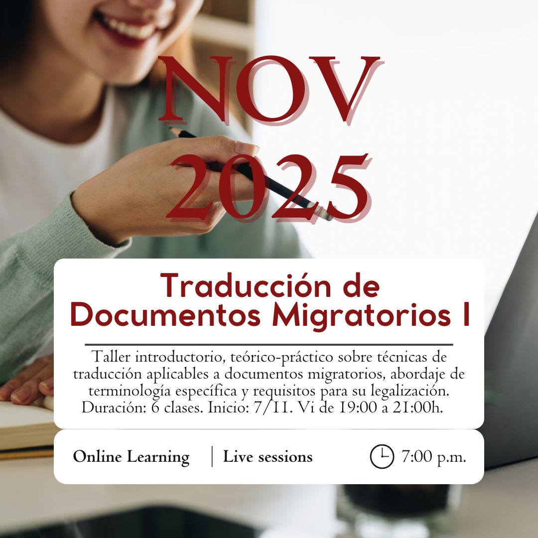- 7/11 Taller de Traducción de Documentos Migratorios. Cursada: viernes, de 19 a 21h, online, en vivo. 5 clases en total.